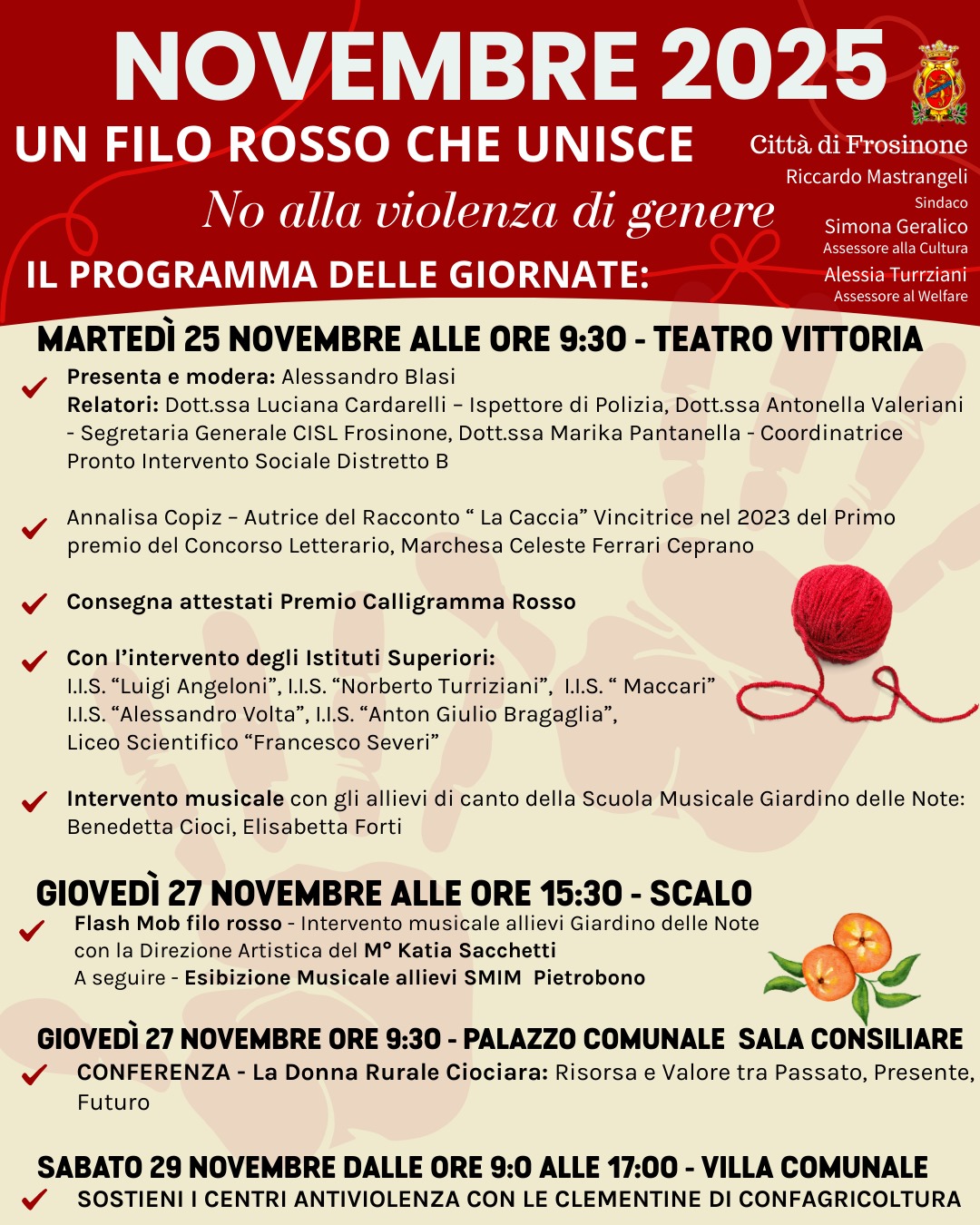 Il Comune di Frosinone, in occasione della Giornata internazionale per l’eliminazione della violenza contro le donne, promuove l’iniziativa “Un filo rosso che unisce – No alla violenza di genere”, organizzata su indirizzo del Sindaco, Riccardo Mastrangeli, mediante gli assessorati alla cultura e alle pari opportunità di Simona Geralico e ai servizi sociali di Alessia Turriziani, con due distinti appuntamenti. Per sensibilizzare la cittadinanza sul drammatico fenomeno della violenza di genere, il Palazzo Comunale sarà inoltre illuminato di rosso dal 21 al 25 novembre, a testimonianza della difesa dei diritti delle donne e della promozione di una cultura del rispetto.