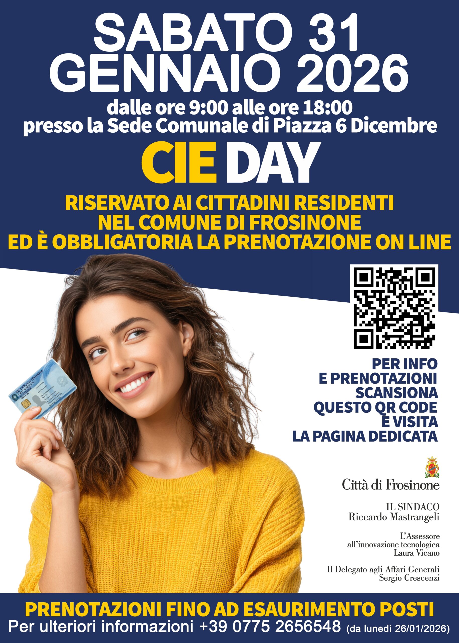 L’amministrazione comunale, su indirizzo del Sindaco Riccardo Mastrangeli, di concerto con l’assessore all’innovazione tecnologica Laura Vicano e con il consigliere delegato Sergio Crescenzi, ha istituito, per sabato 31 gennaio dalle 9 alle 18, presso la sede comunale di piazza VI dicembre, l’Open Day per il rinnovo della carta di identità elettronica. L’iniziativa, che fa seguito agli open day del 5 e 6 dicembre, è riservata esclusivamente ai cittadini residenti nel Comune di Frosinone. Le prenotazioni saranno aperte da lunedì 26 gennaio alle 15. La partecipazione è possibile solo tramite prenotazione online sul sito istituzionale dell’Ente, al link https://servizionlinepa.it/frosinone/openday/, fino a esaurimento posti. La prenotazione è nominativa e consente di prenotare una sola persona per volta (anche nel caso di minorenni); il costo della CIE è di 22,50 euro. Sarà necessario portare con sé fototessera, codice fiscale, tessera sanitaria, carta di identità scaduta o prossima alla scadenza o denuncia di smarrimento; in caso di minori di anni 18, è necessaria la presenza di entrambi i genitori (muniti di apposito documento di identità) o di un genitore con apposita delega e copia di un documento di identità del genitore assente. Per informazioni: 0775/2656548 (da lunedì).